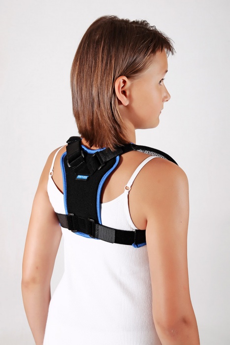 Klavikulární ortéza s vypolstrovanými, délkově nastavitelnými ramenními popruhy, které jsou vytvarovány tak, aby bylo na maximální míru omezeno řezání pod pažemi.