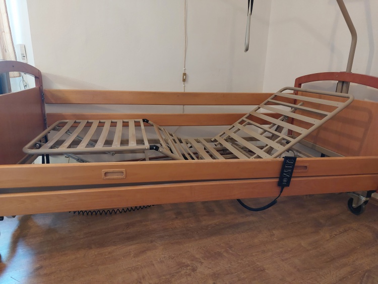 Elektrická polohovací postel 90x210cm (měřeno v čele 103x215cm). Rozkládací čtyřdílný rošt, elektrické polohování roštu, elektrické nastavení výšky lůžka, hrazda s hrazdičkou,